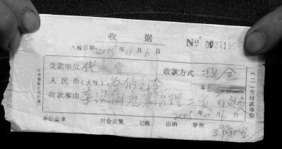 代向記者展示了這個(gè)“最牛收據(jù)”,收據(jù)的時(shí)間為2005年11月6日,收款人名為鄭和生,收款事由一項(xiàng)竟明確寫著:“菜家溝危巖治理工資好處費(fèi)”。代某介紹,鄭和生當(dāng)時(shí)為12組組長(zhǎng)。收款時(shí),鄭稱,自己為村民拿到征地補(bǔ)償,需要請(qǐng)客吃飯,耽誤時(shí)間,所以在他們的征地補(bǔ)償中扣除了300元,并寫下了收據(jù)。事后,代某又多次找到鄉(xiāng)政府、村委會(huì),要求提供扣除補(bǔ)償款的收據(jù),均遭到拒絕。