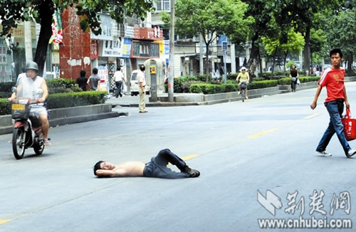 事發(fā)昨日正午,記者在漢陽郭茨口看到,一名男子上身裸露,手提一袋醫(yī)院的病歷資料,情緒激動(dòng)地躺在馬路中央,脊背被路面燙得通紅。此時(shí)路面車流不息,該男子處境十分危險(xiǎn)!翱彀阉貋!”幾名路人見狀后,靠近該男子,欲將其拉到路邊,但該男子并不領(lǐng)情,堅(jiān)決不起身。幾分鐘后,二橋派出所的民警趕來,要求該男子去派出所再說,該男子置之不理。民警表示,早8時(shí)許和10時(shí)許,該男子曾在附近路面躺過兩次,都被他們帶回了派出所,他們這已是第三次為該男子出警!坝惺裁次驼f出來,那樣心里痛快點(diǎn)!币娒窬譄o策,熱心路人們開始輪番上前勸解。眾路人汗流浹背,頂著烈日站在馬路中央,對該男子動(dòng)之以情、曉之以理。半小時(shí)后,該男子陸續(xù)說出了心中的不快。又經(jīng)勸解,該男子終于答應(yīng)跟民警回派出所,將事情說清楚。