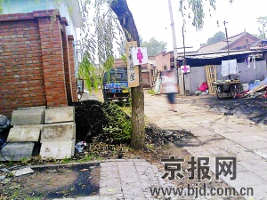 在金盞南村,一處窄小巷口路邊掛著一塊畫(huà)著紅色十字標(biāo)志的硬紙殼牌子,與村子里其他地方掛著的“高價(jià)收廢品”牌子相比,這塊牌子似乎更加低調(diào),連個(gè)漢字都沒(méi)有。