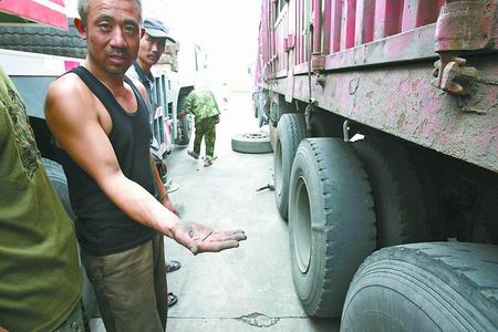 約半小時(shí)后,記者趕到京港澳高速鄭州東服務(wù)區(qū)。西側(cè)服務(wù)區(qū)停車(chē)場(chǎng)里,仍停有七八輛被扎破輪胎的貨車(chē),每輛車(chē)被扎爛輪胎1至3只不等。司機(jī)們一籌莫展,不停嘆氣。
