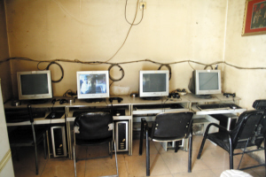 按照王先生的指引,昨天上午,記者來到了位于新中村的這家底商。只見大門上除了網(wǎng)吧兩個(gè)字之外,并沒有具體的招牌。走進(jìn)屋內(nèi),50多平方米的室內(nèi)擺有30多臺電腦。兩名20歲左右的男青年坐在控制室里負(fù)責(zé)收錢。此時(shí),一名中年男子走了進(jìn)來,對控制室內(nèi)的一名黃頭發(fā)青年說道:“網(wǎng)管,幫忙給上一下。你教過我的,可我沒記住。”說完,兩人就很有默契的一起來到了靠近角落的一臺電腦旁。