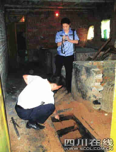農(nóng)戶王定平家四門緊閉,而屋后則堆積有七八噸煤炭。工作人員用鋼條、電筒等工具在屋內(nèi)進行“地毯式”搜索。鋼條敲打王家?guī)孛鏁r,發(fā)出了空響;刨開地面上堆積的煤灰,下面是一塊長條形水泥板;揭開水泥板,一個能容一人進出的煤洞,出現(xiàn)在眼前。