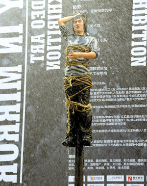 37攝氏度的高溫下,26歲的王軍被綁在近10米高的柱子上,先是被酷熱“折磨”了半小時,后又被環(huán)衛(wèi)車的水龍頭沖淋了半小時,耗費(fèi)了8噸自來水,總共耗時兩小時。這個名為《守望》的行為藝術(shù)作品昨天下午在黃桷坪102藝術(shù)區(qū)雷倒了不少人!