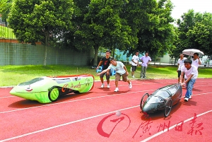 歷經(jīng)暑假兩個多月打造,外形如一顆黑色子彈、25毫升汽油可跑8000米的概念車“子彈頭”驚艷亮相,近日在華農(nóng)大操場進行了性能測試。這輛車的制作團隊主要由30多名大三大四學(xué)生組成,從制作配件到設(shè)計安裝全部手工完成。該車全長3.2米,高70厘米,重約20公斤,由一人駕駛,時速可達40~50公里,本月下旬將赴上海參加一項節(jié)能車競技大賽。