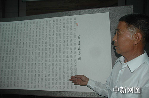 中新網(wǎng)唐山9月8日電 (白云水 雷向東)8日,河北省遵化市退休干部劉宗易80米長、由10000個(gè)異體壽字組成的“華夏萬壽圖”正式完成。劉宗易稱,此舉為慶祝新中國成立60周年獻(xiàn)禮,寄托自己對(duì)祖國的一片祝福之情。