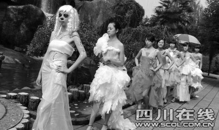 活動現(xiàn)場,七八名大學(xué)生美女志愿者身穿五顏六色,用紙袋、塑料袋、筷子和孔雀羽毛等奇異材料制成的服裝為游客們獻(xiàn)上了一場別出心裁的時裝秀,向每一位游客宣傳環(huán)保理念。據(jù)了解,這些紙裝是武漢一高校服裝設(shè)計專業(yè)的學(xué)生精心制作的,他們希望和成都的同學(xué)共同呼吁市民愛護(hù)環(huán)境。來自武