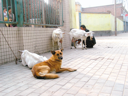 幾天前,記者在韋曲街道見到了老魏,老魏正忙著擠羊奶。老魏告訴記者,他養(yǎng)這4只奶山羊,“虎子”幫了大忙咧。老魏說的“虎子”其實就是臥在4只羊跟前的一條黃狗。“這虎子今年才3歲,可真是羊的鐵桿保鏢!崩衔撼鲩T賣羊奶,他背個手在前面走,“虎子”領(lǐng)著羊兒跟在后面。到了下午,老魏到坡上放羊。他把“虎子”叫到羊跟前,吩咐一聲“把羊看好”后,便忙別的事!盎⒆印笨墒潜M職盡責,一直守在羊跟前,生人要想靠近羊兒連門都沒有。天快黑了,老魏來到坡下,“回家咧!”一聲吆喝,“虎子”領(lǐng)著羊群順溜溜地下了坡!3年來,還沒丟過羊呢!崩衔赫f起虎子來贊不絕口。