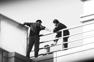 在該大廈樓頂?shù)奈髂辖,一男子站在樓頂護(hù)欄外,雙手握著欄桿,并不時(shí)扭動(dòng)著身體。為避免該男子情緒波動(dòng),警方一邊勸說(shuō)該男子,一邊疏散圍觀群眾。