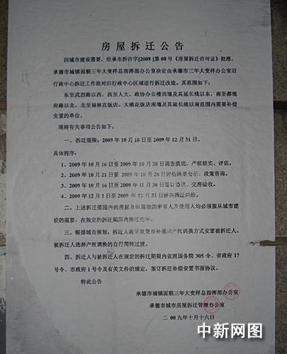 在10月16日由承德市城鎮(zhèn)面貌三年大變樣總指揮部辦公室以及承德市房屋拆遷辦公室印發(fā)的《房屋拆遷公告》明確顯示:10月16日至10月20日為老行政中心房屋產(chǎn)權(quán)調(diào)查摸底、產(chǎn)權(quán)核實(shí)、評(píng)估階段,并由“承德市三年大變樣辦公室舊行政中心拆遷工作組”實(shí)施拆遷。而金源公司于10月18日就開(kāi)始強(qiáng)行拆除皇家安裝工程公司辦公用房。