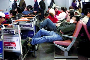 受降雪影響,昨日,首都國際機場部分航班延誤或取消,大批乘客滯留。