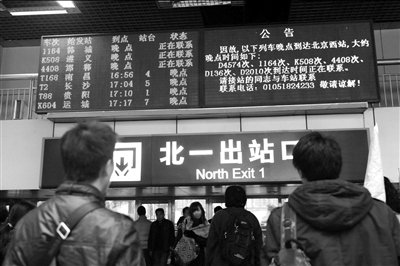 受10日以來石家莊暴雪影響,經(jīng)京廣線進京的列車大面積晚點。昨天(11日),共有124趟進出北京西站的列車晚點,大量旅客的行程受到影響。為此,北京西站啟動應(yīng)急響應(yīng),開放全部候車大廳,旅客可選擇全額退票。 昨天下午4點多,記者在北京西站進站大廳內(nèi)看到,顯示屏上有17趟從西站始發(fā)的列車顯示為晚點,還有7趟列車未標明發(fā)車時間。在屏幕下方,滾動字幕顯示晚點列車信息。各個候車室外均增加了鐵路工作人員,負責維持秩序并做解釋工作。