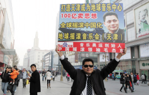 一款黑墨鏡,一襲黑風(fēng)衣,昨天(12月13日),當(dāng)一位長(zhǎng)相頗似著名影星周潤(rùn)發(fā)的外地男子出現(xiàn)在(天津)和平路上時(shí),引起了不少人的注意。而當(dāng)他高舉起一幅廣告牌的時(shí)候,更有不少人對(duì)他的精神狀況產(chǎn)生了懷疑!按蛟焯旖虺蔀榈厍蛞魳(lè)中心”、“100億賣(mài)思想”,遠(yuǎn)遠(yuǎn)看著廣告牌上這些“雷人”的宣傳語(yǔ),大伙兒不敢靠近。