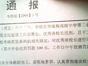 昨天上午,記者根據(jù)網(wǎng)友提供的地址打開(kāi)該網(wǎng)頁(yè)時(shí),發(fā)現(xiàn)了一篇題為《最猛校長(zhǎng)》的帖子,一則蓋有“鄭梁梅學(xué)!惫碌耐▓(bào)內(nèi)容稱:12月11日下午1時(shí),學(xué)校在鄭梁梅第二會(huì)議室組織召開(kāi)各學(xué)部校園文化建設(shè)工作部署會(huì),因校長(zhǎng)沈秀清遲到,且在工作日中午喝酒,所以根據(jù)學(xué)校獎(jiǎng)懲條例相關(guān)規(guī)定,對(duì)沈秀清校長(zhǎng)通報(bào)批評(píng)并罰款600元。在帖子里,記者發(fā)現(xiàn)600元罰款分兩種:開(kāi)會(huì)遲到罰款100元,工作日中午飲酒罰款500元。