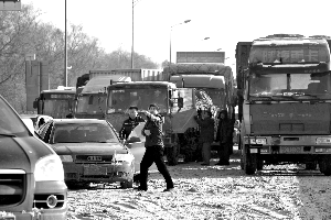 昨日下午1時(shí),八達(dá)嶺高速路水屯出口處,出京方向,大貨車排成約20公里的長(zhǎng)龍,前后看不到盡頭。由于長(zhǎng)時(shí)間沒(méi)有挪動(dòng),一些司機(jī)或下車探路或在車上睡覺(jué)。交警介紹,目前水屯路口積雪清理完畢,車輛今日可完全疏散。據(jù)了解,累計(jì)數(shù)千輛大貨車因雪被困在此兩日夜。