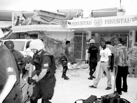 海地時間1月12日下午4時50分,太子港發(fā)生地震時,于江樺和在太子港工作的中國同事劉昆開車前往聯(lián)海團總部大樓接一位美國同事。車子在大樓前還沒停穩(wěn),大家就覺得車子在晃,一樓已經(jīng)冒出大量白色灰塵并伴隨著轟鳴聲,于江樺和劉昆下車后趕緊向遠(yuǎn)離大樓的地方跑。由于地面在震顫,根本無法站立,倆人只好蹲下等地震停止。大約30秒鐘后,于江樺和劉昆轉(zhuǎn)過頭來,看到聯(lián)海團總部大樓已經(jīng)完全坍塌。于江樺連忙掏出手機撥打隊長趙化宇的手機,但此時信號已經(jīng)中斷。這時防暴隊長說:“我們的代表團正在樓里開會!甭牭竭@個消息后,于江樺的頭一下子就蒙了。