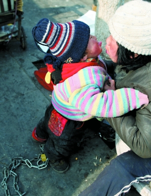 昨日,房山良鄉(xiāng)華冠購物中心西側(cè),陳傳六正在趴活,臉上有多處凍瘡。距摩的兩米遠的路牌子下鋪著紙板,放著簡易童車。他兩歲的兒子坐在紙板上喝著冷奶,奶嘴發(fā)黑。一名黑車司機朝小孩喊“金蛋兒”,小孩朝他笑。