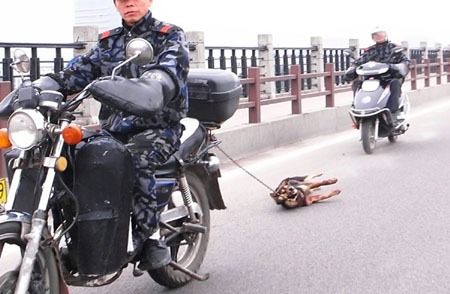 摩托車后系著一條鐵鏈,拖著一只血肉模糊的狗飛奔。昨天,一組被標(biāo)著“慘無(wú)人道”標(biāo)題的照片在福州各大論壇瘋傳,甚至被稱為福州版的虐狗門。拍下這些照片的網(wǎng)友表示,在春節(jié)期間看到如此一幕非常難受,而有網(wǎng)友認(rèn)為這可能是有人在偷狗。