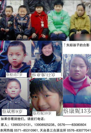2月18日,天臺縣三合鎮(zhèn)下路王村的蔡修明、蔡修通兄弟家的5名兒童突然失蹤。據(jù)了解,蔡家兄弟常年在甘肅做生意。過年期間,蔡家兄弟帶兒女們回老家過年。2月18日14時許,蔡修通13歲的女兒蔡亞妮帶著3個親姐弟及蔡修明的小兒子蔡松濤,去1公里外的同誼村找同學玩。一小時后,蔡亞妮的母親發(fā)現(xiàn)找不到女兒了。隨即,蔡家人發(fā)動全村親友尋找。但村民兩百余人遍尋周邊村莊、山上、湖泊都未找到。