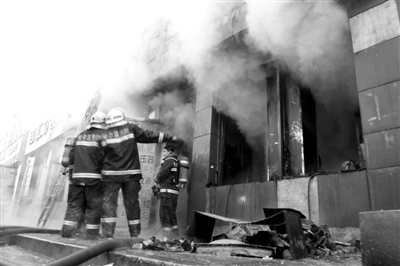 7時(shí)許,記者在現(xiàn)場看到,一家經(jīng)營變頻器的門市房內(nèi)冒出滾滾濃煙,火借風(fēng)勢很快將樓上一家旅店引燃,消防人員正在二層破拆打水撲救,并迅速將屋內(nèi)的煤氣罐轉(zhuǎn)移,二層的近10扇窗戶玻璃被擊碎排煙。經(jīng)過兩個(gè)小時(shí)的救援,火勢被控制住。此時(shí),門市房受損嚴(yán)重,室內(nèi)的物品被燒焦,窗戶玻璃破碎。人行道及車行道上的積水結(jié)了一層薄冰。