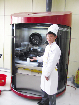 記者昨日在現(xiàn)場看到,“愛可2.0”高約2米,寬約1.8米,有拉門封閉,里面有特制的烹飪設(shè)備,有鍋,有自動噴油、噴水、攪拌設(shè)備,與之相連接的是一個智能化觸摸屏,上面是系統(tǒng)控制界面。在正式烹飪前,早已“定量”好的主料、配料和作料都被放在專用盒子里。工作人員將“杭椒牛柳”的材料送入“愛可2.0”,在觸摸屏輸入程序,機器人開始工作。