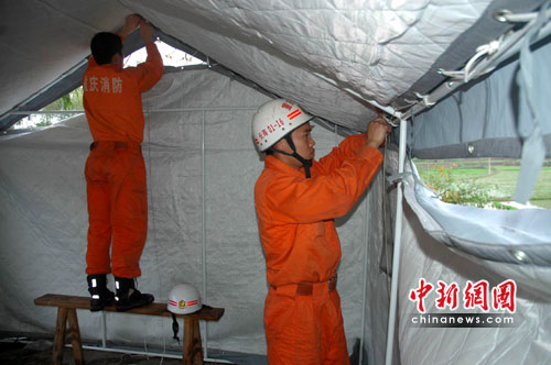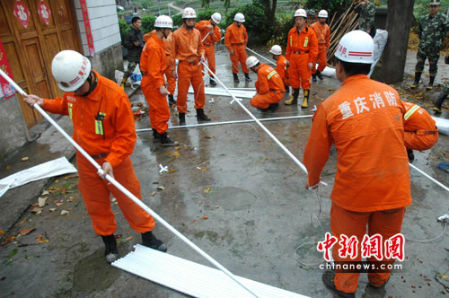 在重慶市墊江縣李白村九組,一頂藍(lán)色的救災(zāi)帳篷經(jīng)過(guò)消防官兵的緊張搭建成形,災(zāi)民湯強(qiáng)上前與消防官兵們緊緊握手,感激得熱淚盈眶……