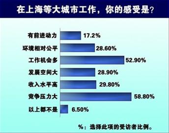 調查顯示,在上海工作生活多年的受訪者,對這座城市感受最直接的是:競爭壓力大位列第一,達到58.8%;其次是工作機會多,達到52.9%;第三是收入水平高,為29.8%。