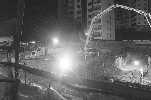 當(dāng)天凌晨1時許,記者來到該施工工地上,該工地開著明亮的燈光,挖出了三四米深的地基,一輛混凝土攪拌車發(fā)出“哐哐”的響聲,數(shù)十名工人正在地基上鏟水泥。凌晨1時20分許,市城管支隊特勤大隊的執(zhí)法人員趕赴現(xiàn)場,要求施工方立即停工!拔覀兒瓦@些混凝土公司預(yù)約好了,一停工會損失很多錢!笔┕し揭幻(fù)責(zé)人與執(zhí)法人員求情。執(zhí)法人員告知,目前屬于中考高考階段,決不允許建筑工地超時施工影響學(xué)生和周邊居民休息。執(zhí)法人員當(dāng)場責(zé)令正在趕工的混凝土攪拌車退出施工地點。