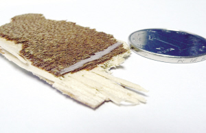 記者看到304室北面小屋的門,有一部分用牛皮紙貼上,輕輕撕開紙,赫然出現(xiàn)一個(gè)大洞。她說這是有天早晨喊女兒起床時(shí)敲通的。一個(gè)年過半百的女子,竟然敲門時(shí)就輕易地把門敲通,可見這門板的質(zhì)量。果然,記者很輕易就掰下一塊面板,這種復(fù)合木板的厚度不到3毫米,難怪經(jīng)不起“敲”。