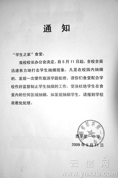 2010年6月1日,普洱市思茅區(qū)教育局向區(qū)屬23所校園發(fā)出《思茅區(qū)教育局關(guān)于在校園內(nèi)公共場(chǎng)所禁煙的通知》(以下簡(jiǎn)稱《通知》)!斑@是云南省第一家自發(fā)進(jìn)行控?zé)煿ぷ鞯慕逃龁挝弧!痹颇鲜〗】到逃責(zé)熮k公室主任趙白帆說(shuō)。