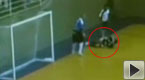 實(shí)拍:一室內(nèi)足球隊(duì)員滑倒被地板碎片