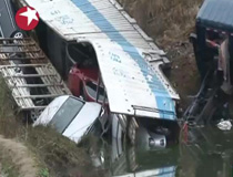 16輛全新轎車集體"泡澡" 半掛車失控栽池塘
