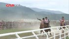 【解說】比賽采取“四塊雞”的獨(dú)特吃法,就是把一只雞白灼后,分成四塊,人們用手抓起來大口吃肉。隨著裁判一聲令下,選手們紛紛狼吞虎咽,嘴里塞得滿滿當(dāng)當(dāng)。
