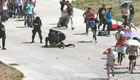 【解說】5月29日上午,河南鄭州,鄭東派出所民警受邀到鄭東海文實驗幼兒園傳授安全防范常識,在進行裝備展示、槍支演示環(huán)節(jié)時發(fā)生意外。一名警察的槍支“走火”,子彈射中地面,濺起的水泥碎屑刮傷周圍四名家長和一名兒童的腿和胳膊。目前傷者已被送至河南省直第三人民醫(yī)院進行治療。