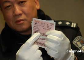 假票主要有“回頭票”、“補(bǔ)、涂改票”、“整版假票”三種;仡^票一般票面較舊,且已被剪口;補(bǔ)、涂改票由于刮掉了一部分纖維,顏色會(huì)有些發(fā)白,整個(gè)票面顏色不統(tǒng)一;而假票票面“中國(guó)鐵路”標(biāo)志以及背面的水印較為模糊,用手輕揉票面文字及數(shù)字時(shí),油墨即會(huì)沾在手上。
