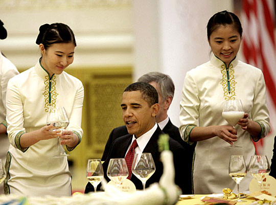 圖:奧巴馬輕松出席胡錦濤主席歡迎宴會(huì)