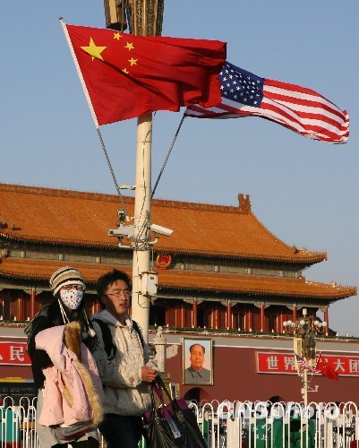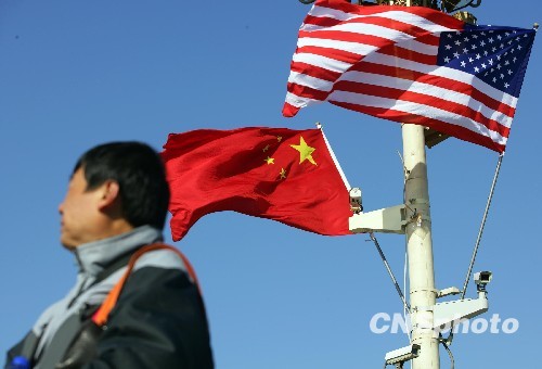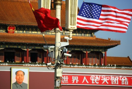 圖:中美兩國(guó)國(guó)旗天安門廣場(chǎng)共飄揚(yáng)