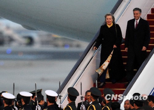 圖:希拉里與奧巴馬同機(jī)抵達(dá)北京
