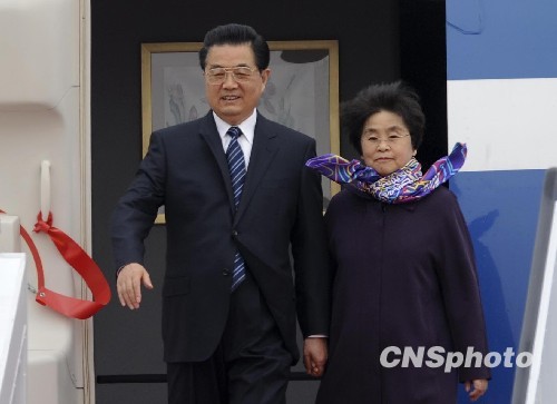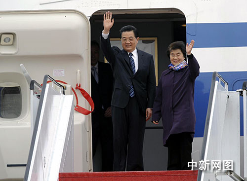 圖:胡錦濤主席與夫人攜手步下飛機(jī)