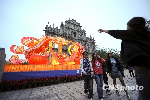 澳門大三巴牌坊前立起慶;貧w十周年花燈