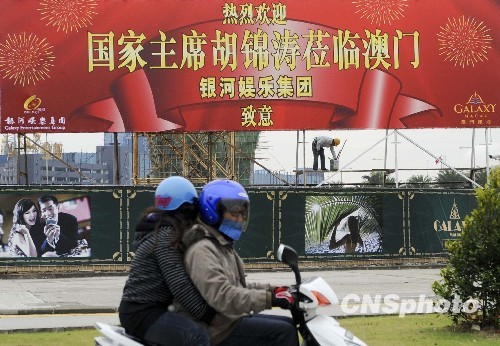 圖:澳門街頭立起歡迎胡錦濤主席標(biāo)語(yǔ)