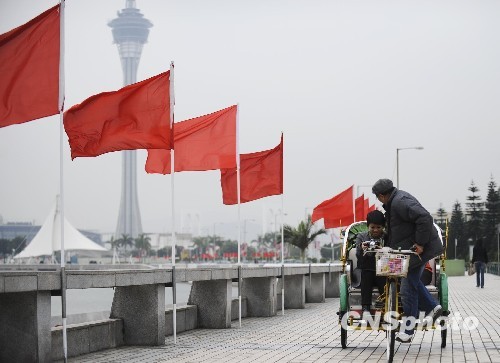 圖:澳門街頭紅旗飄飄迎接回歸十周年