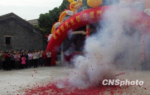 澳門新特首就任 家鄉(xiāng)人鳴放炮竹