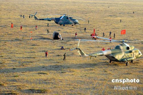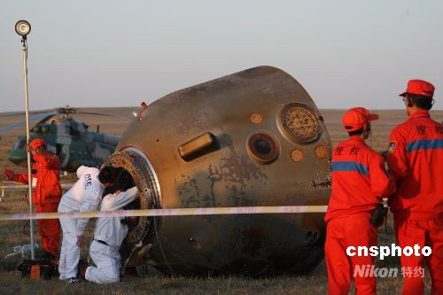 圖:搜救隊(duì)員到達(dá)神七返回艙著陸現(xiàn)場(chǎng)