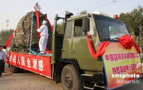中國(guó)空間技術(shù)研究院迎接神七返回艙回家