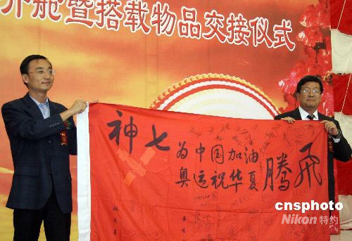 圖:“神七”載人飛船總設(shè)計(jì)師張柏楠移交返回艙搭載簽名旗幟