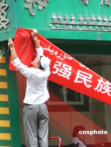 圖:烏魯木齊市一店主懸掛“民族團結(jié)”橫幅