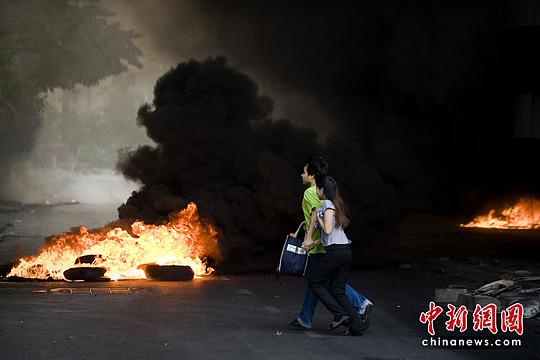 “紅衫軍”在一所醫(yī)院附近集會并燃燒輪胎