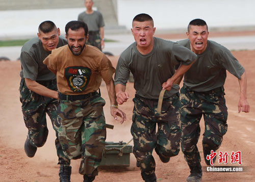 7月4日,參加“友誼—2010”中國巴基斯坦反恐聯(lián)合訓(xùn)練的兩軍士兵進(jìn)行體能訓(xùn)練。此次訓(xùn)練在中國寧夏青銅峽地區(qū)展開,主要以邊境地區(qū)山地聯(lián)合反恐作戰(zhàn)為課題,分為展示交流、混編同訓(xùn)、綜合演練三個(gè)階段。這是兩國之間舉行的第三次反恐聯(lián)合訓(xùn)練。中新社發(fā) 杜洋 攝