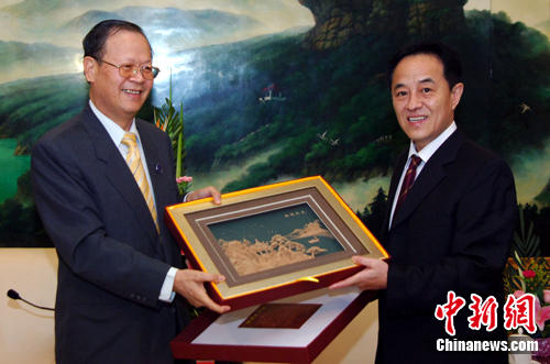 7月28日傍晚,中國最高人民法院副院長、中國法學(xué)會審判理論研究會副會長、二級大法官奚曉明先生(右)與海峽兩岸法學(xué)交流協(xié)會(臺灣)理事長廖正豪(左)先生互換禮物。當日中國最高人民法院副院長奚曉明在福州福建會堂會見來自海峽兩岸的近二百名知名法學(xué)家、司法實務(wù)界人士,其中來自臺灣29名法學(xué)及司法嘉賓。海峽兩岸司法實務(wù)研討會即將在福州舉行。攝影:張麗君