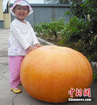 近日,山東省文登市劉家莊村鄒積泉老漢在果園收獲了一個(gè)67公斤重的巨型南瓜,令人們感到驚奇,引得周邊市民紛紛前來參觀。一些好奇的人對(duì)這一特大南瓜進(jìn)行測(cè)量,南瓜重67公斤,直徑約0.64米,高0.60米,周長(zhǎng)約2米。